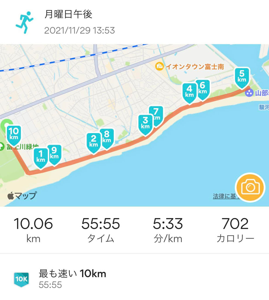 しかも、5分33秒/kmと、長い間切れなかった40秒の壁を越えられた。最後は足が動かなくなったが、気持ち良く10kmを走り切れた。