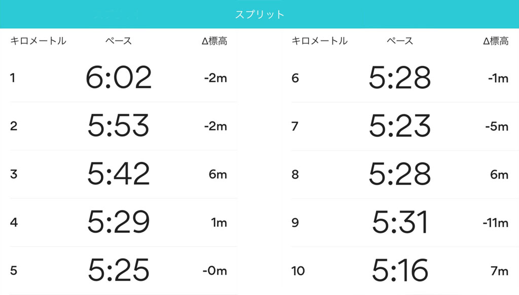 体が温まるまでの前半3kmを抑え気味に、中間をほぼイーブンペースで走れたことが達成出来た理由だろう。