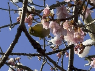 冬 三嶋大社 雪と河津桜とメジロと