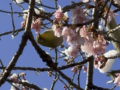 近所の5分咲きの河津桜は、雪と寒さに耐えて咲いている。