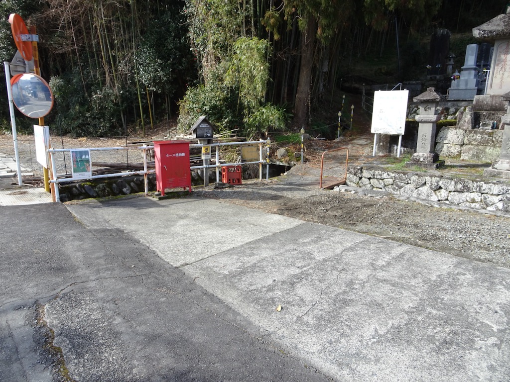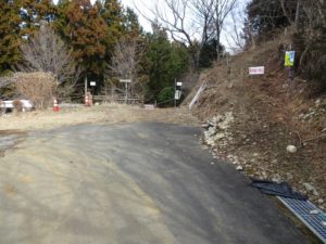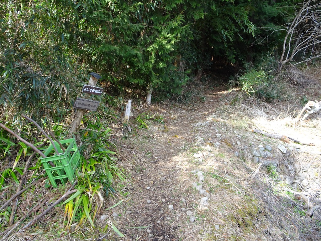 県道10号線を少し戻り、墓地の南側の白鳥山登山道入口(写真)を入る。 案内板横のコンクリートの坂道を上り、集落の間を通り、民家の入口の登山口案内板に従って庭先をすり抜け、茶畑横の白鳥山登山口に着く。