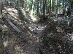林に入るとすぐに塩出分岐で、右の登山道に入り竹林をゆるやかに登る。 尾根に乗ると、深く抉れたゆるやかな道(写真)を折り返して登るようになる。