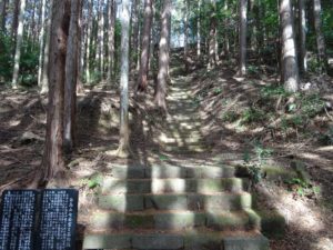 尾根を左に外しトラバース気味にたどると、ほどなく白鳥山七面宮階段の下に出る(写真)。 2枚の石盤に記された謂れを読み、175段の石段に挑む。段差がちょうど良く登りやすいが、それなりに傾斜があり、それなりに足に堪える。
