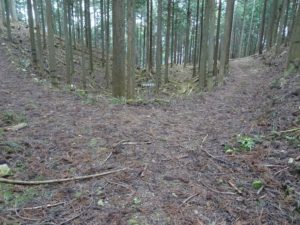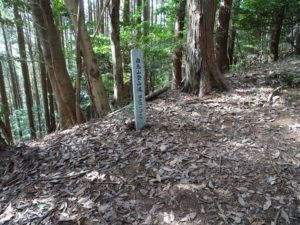 「横堀阻塞跡」の標識(写真)の立つ分岐を右に取ると、次第に登山道は左にカーブし尾根から遠ざかるため、登山道を外れて強引に尾根に向かう。