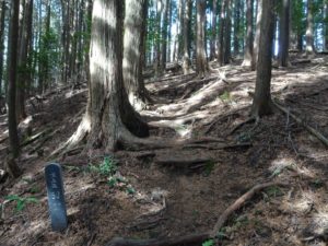 広場の左を上がると、すぐに石盤がある。かつて展望台だったが、木が生長しまったく展望はない。2020年に訪れたときは、まだ石盤の文字が読めたが、今は消えてしまっている。 再び深く抉れた登山道(写真上)をジグザグに登り、「頂上迄1.0キロ」の道標(写真下)を通過する。