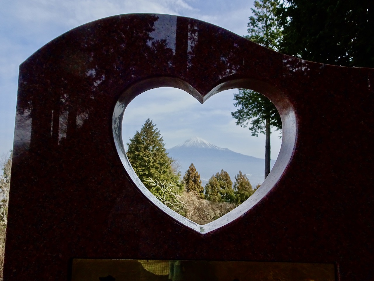 広い山頂には、2本の山頂標柱や恋人の聖地のモニュメント、鐘、方位盤(写真右上)、狼煙台跡(写真右下)がある。 北東から西にかけて大きく展望が広がる。富士山、篠井山、大光山、奥大光山、七面山、思親山、白水山、毛無山、下十枚山、十枚山など身延山地を一望する(写真下)。この日は春を思わせる気温で霞気味で、思親山左の南アルプスは薄っすらとしか見えないのが残念だ。 モニュメントのハートの向うに見る富士山(写真下)も良い感じだ。 特等席から富士山を見ながら昼食タイム。。。だが、日陰でゆるやかに吹き抜ける風が、ジッとしていると肌寒い。