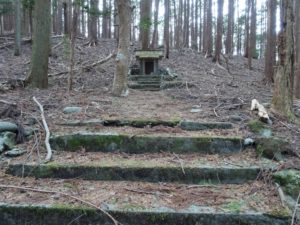 標高250mあたりでしっかりした石段の奥に祠(写真下)を通過し、さらに下って行く。 尾根を右にUターン気味に折れ竹林混じりになると、ほどなく県道10号線に降り立つ。