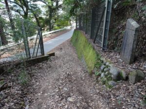 南西に延びる「富士山を見下ろすコース」の階段(写真上)を下り、5分ほどで林道に降り立ち、右へわずかで白鳥山森林公園駐車場を左に見て「池代コース」(写真下)に入る。