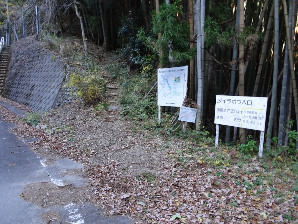 道なりに20分ほどで、林道のどん突きのダイラボウの道標がある登山口に着く。