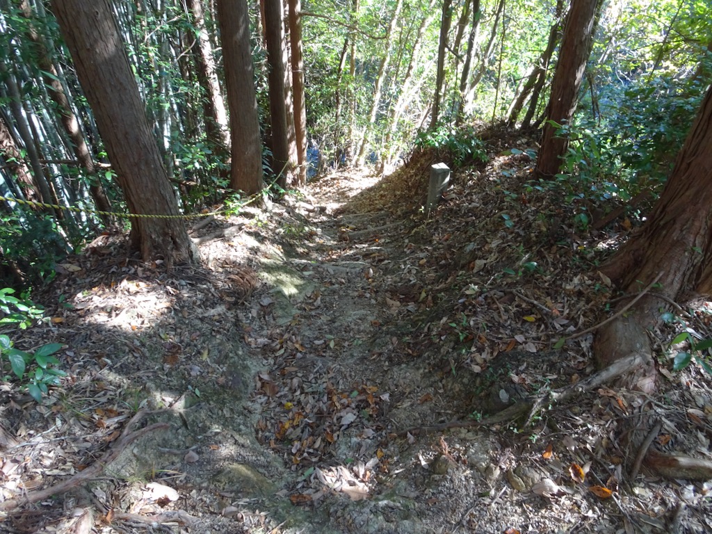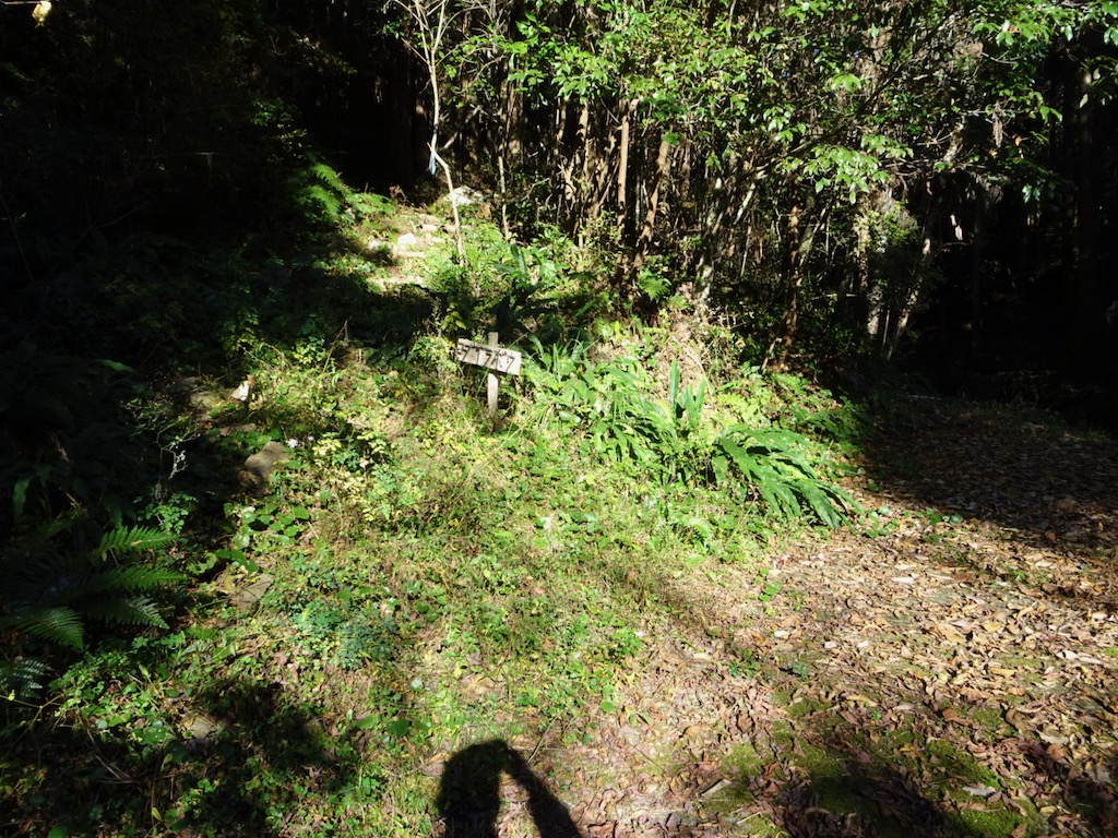 標高300mを切る頃、いったん竹林に変わり、西又峠の道標(写真上)が出てくると、短い急下降(写真下)からポンと西又峠ダイラボウ入口に降り立つ。