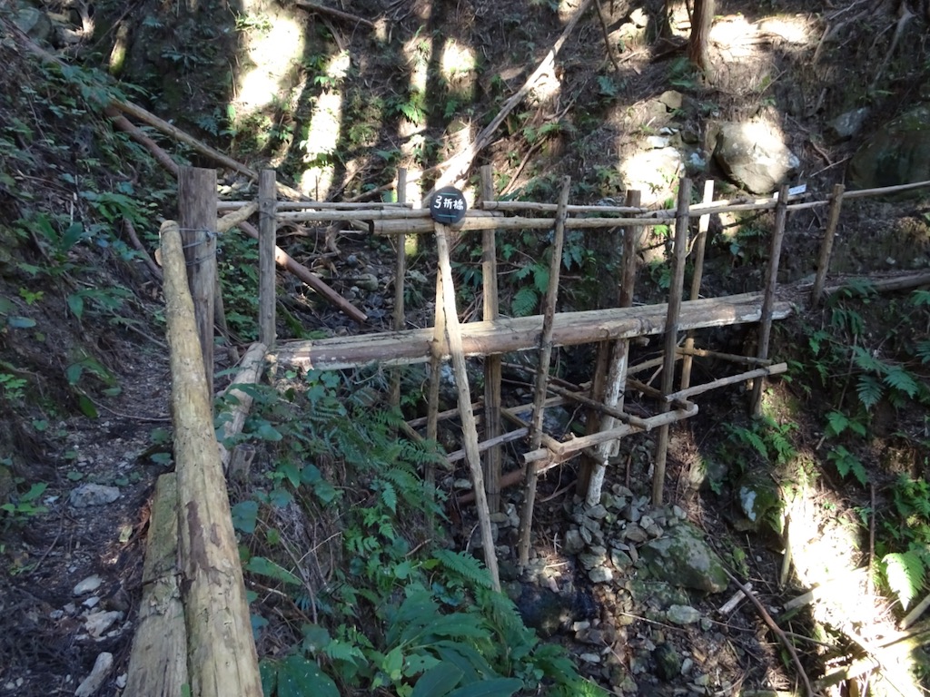 沢沿いをゆるやかにたどると、5分ほどで支沢に架かる弓折橋(写真上)が現れる。丸太を組み合わせた、何とも趣のある橋だ。