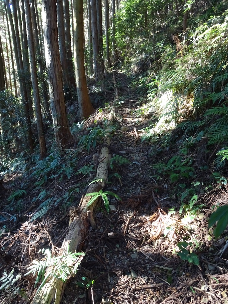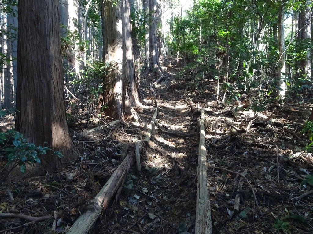 北側に延びる尾根をゆるやかに登って行く。両側に丸太が敷かれ、良く整備されている(写真)。