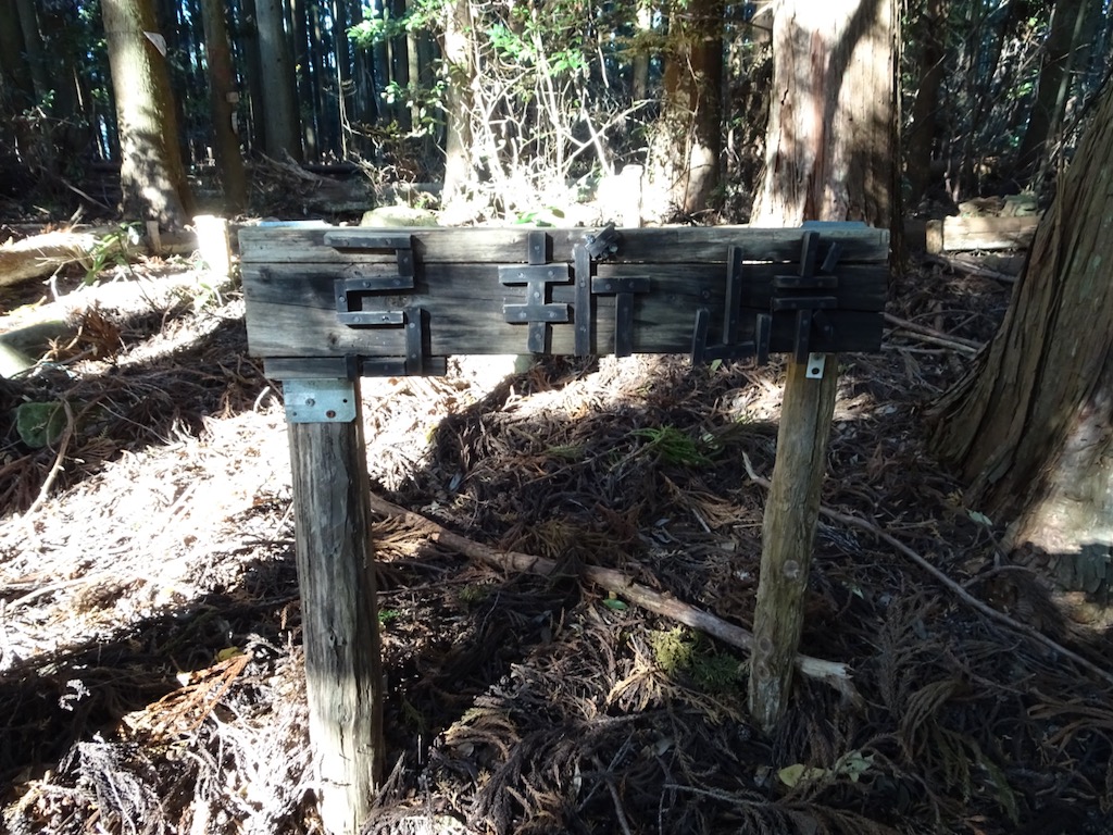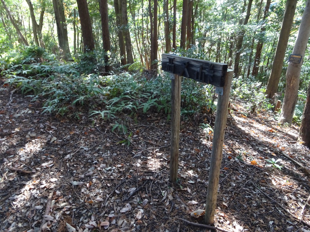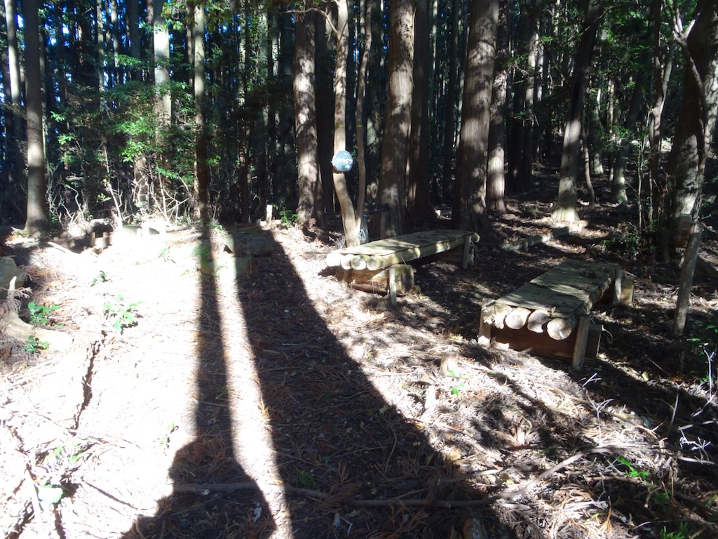 峠としては立派な道標(写真下)とベンチがある。 完全に林の中で、展望はない。また、分岐になっていて、直進は玉取沢方面になる。