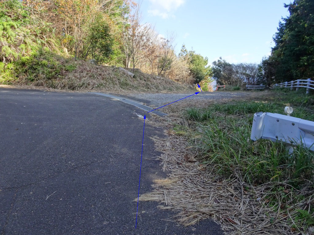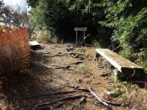 森林整備の車が停められた先の左カーブを右に入り、通行止めのロープを左に上がる(写真)と、すぐにダイラボウの南端のトイレ前に飛び出す。
