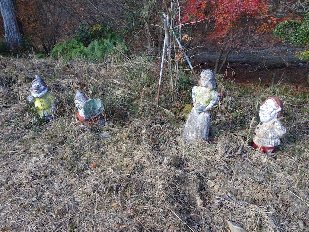 中ほどで白雪姫の面々の出迎えを受け(写真右上)、北側のダイラボウテイクオフと呼ばれる広場(写真右中上)から道標に従って、東側の階段を上がる。