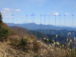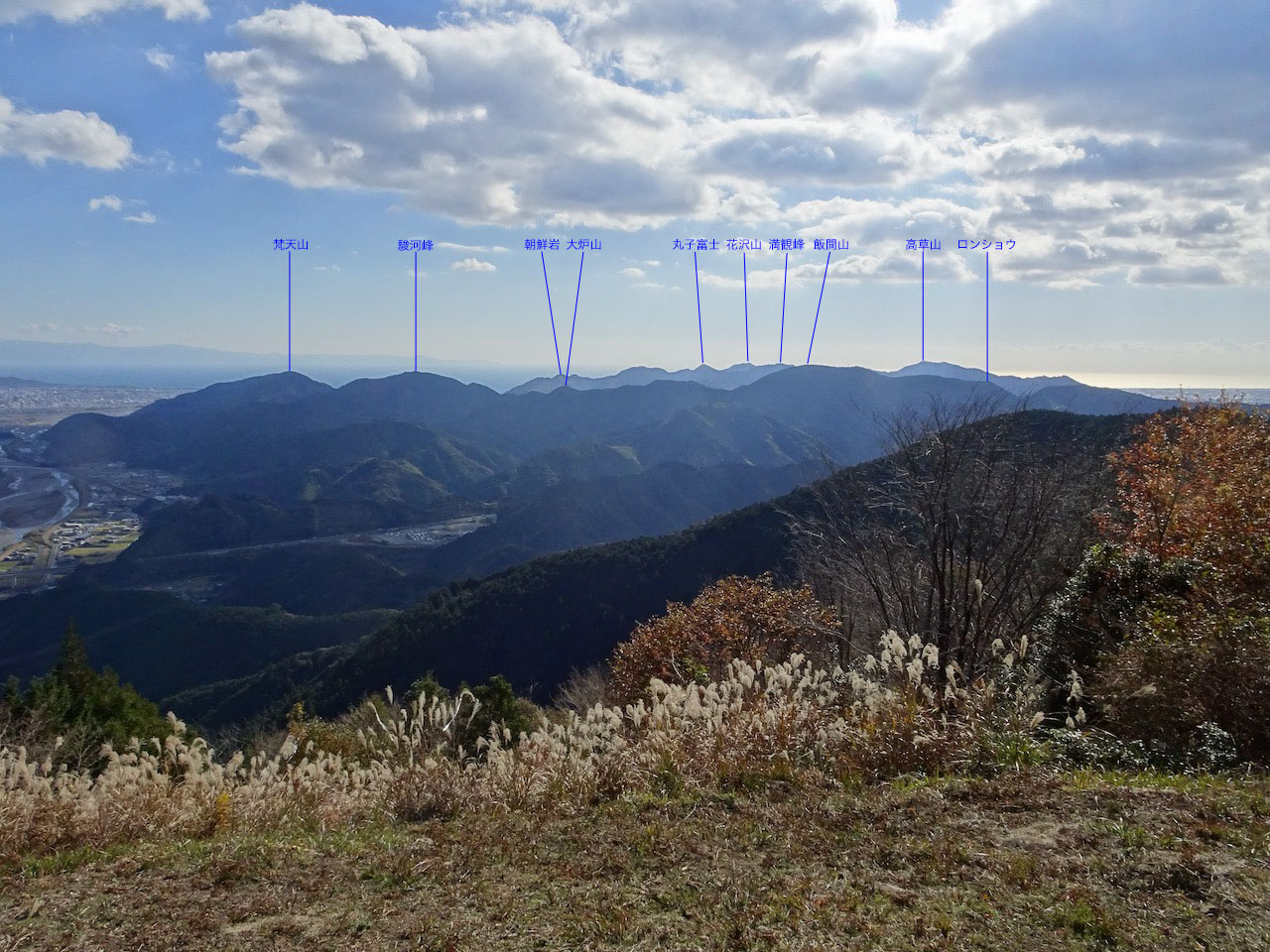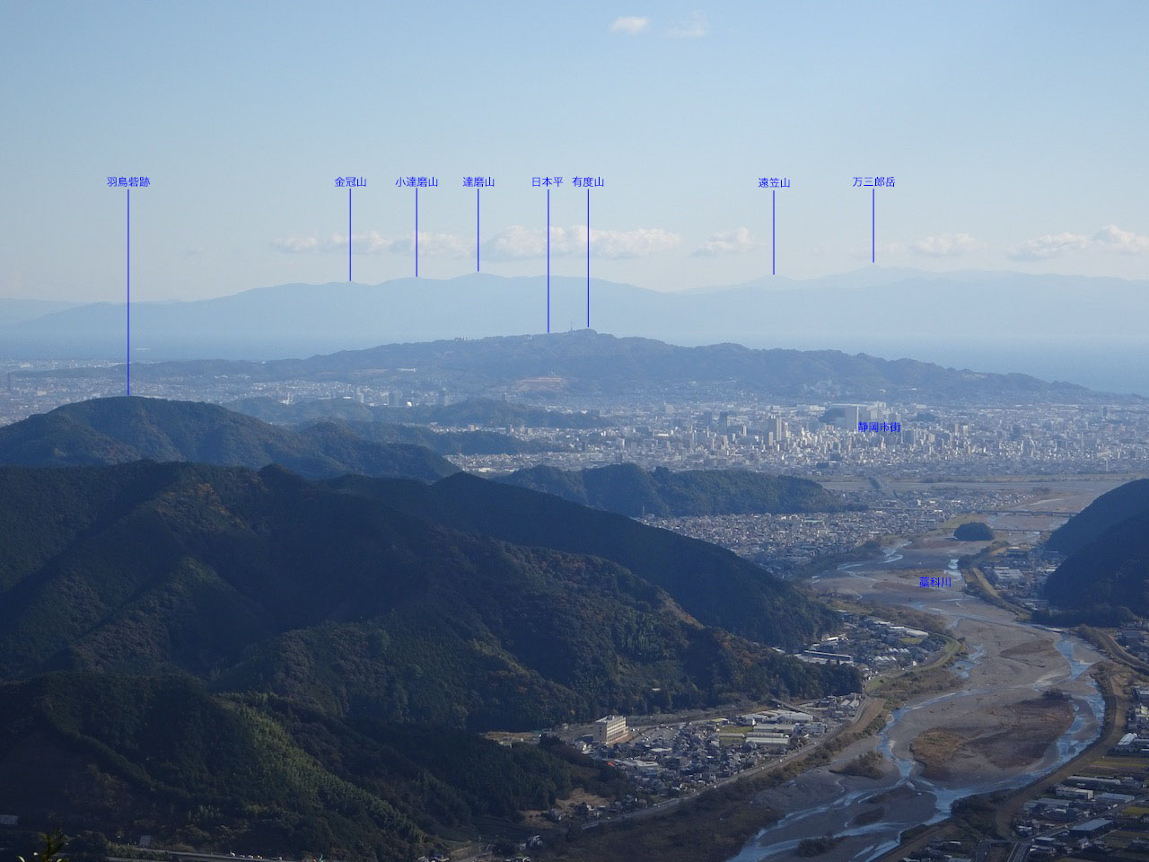 このあたりが一番展望が良く、富士山から竜爪山、愛鷹山、箱根山、日本平、伊豆の山々(達磨山、天城山など)、駿河の山々(満願峰、高草山など)と大パノラマ(写真下)が見られる。