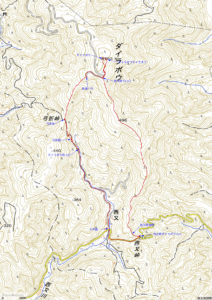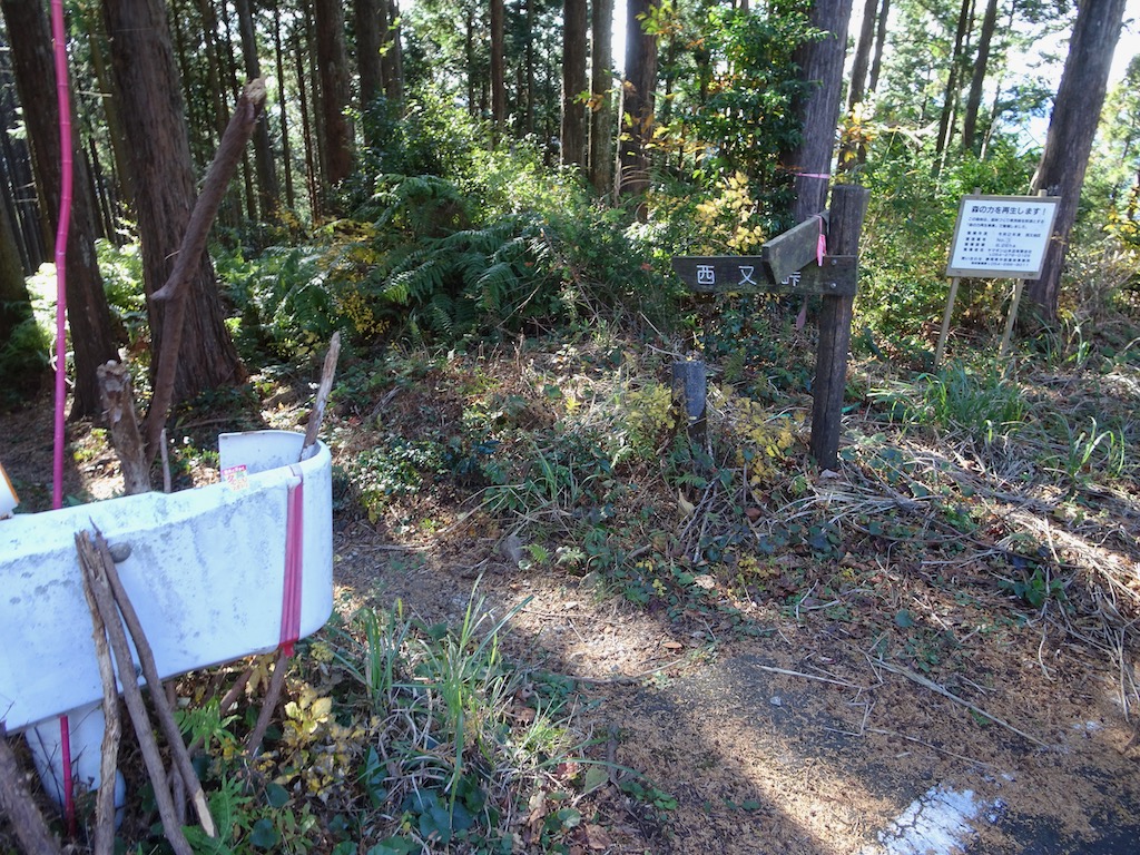 林道出合(9:49)→ ダイラボウ山頂(9:56-10:56)→ 西又峠下山口(10:57)→ 西又峠道標(11:29)→