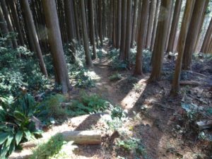 杉林の中をひたすら下って行く(写真下)。 途中で森林整備の方3人と挨拶を交わす。