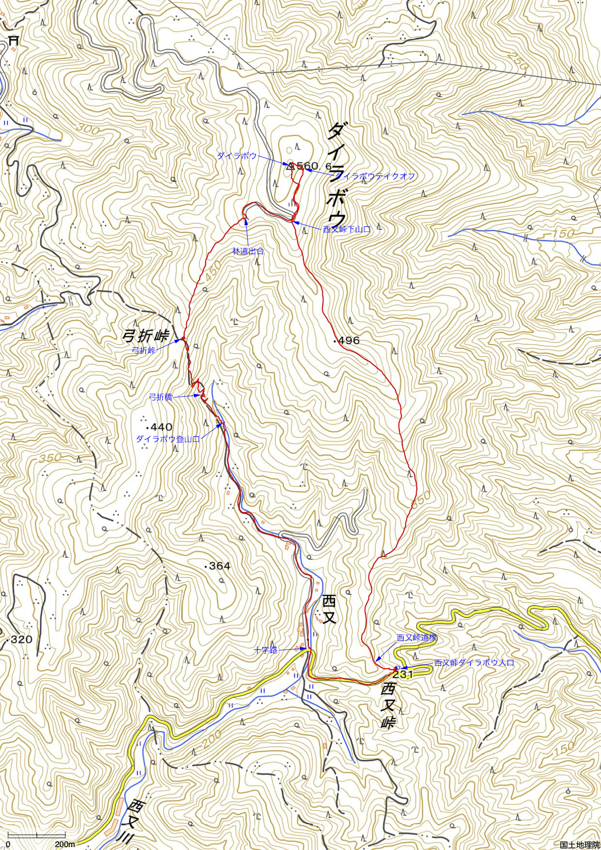 行程詳細 西又峠ダイラボウ入口(8:40-8:55)→ 西又集落十字路(9:01)→ ダイラボウ登山口(9:16)→ 弓折峠(9:31-9:36)→