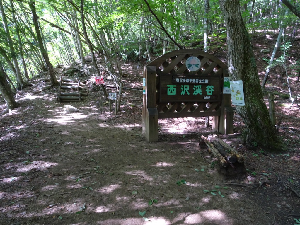 西沢渓谷の看板があるので、ここからが西沢渓谷になるのだろう。また、鶏冠山への道が右に延びる。 短く尾根を上がった後、渓谷を高巻くようにたどる。
