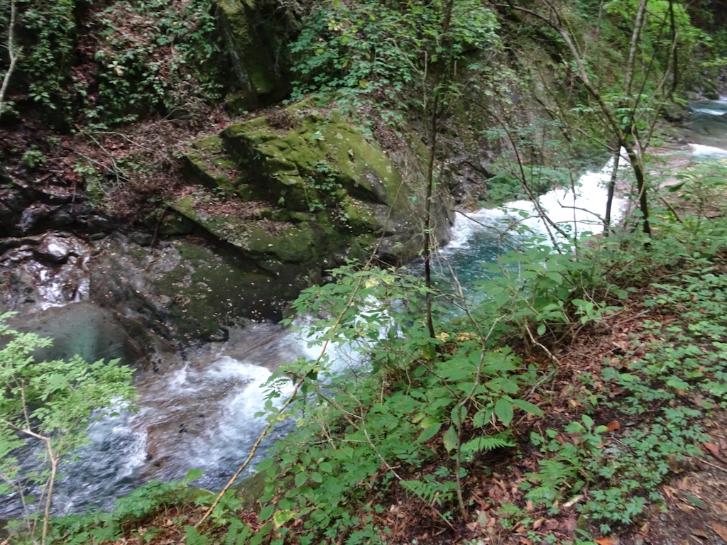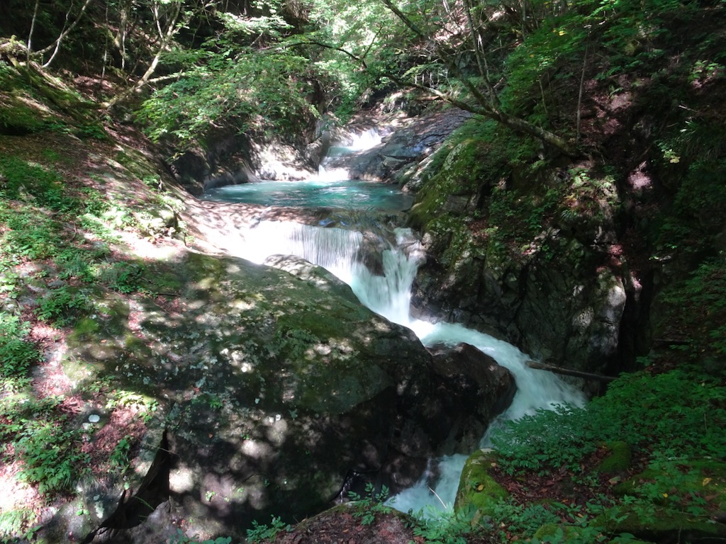 岩がゴロゴロする渓流沿いから、岩場をゆるやかに登ると竜神の滝(写真)に至る。