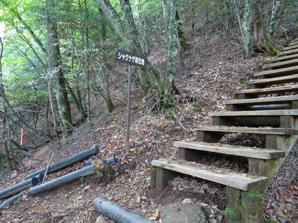 木の階段をジグザグに登り、尾根を乗り越して下ると、三重の滝の道標に出る。