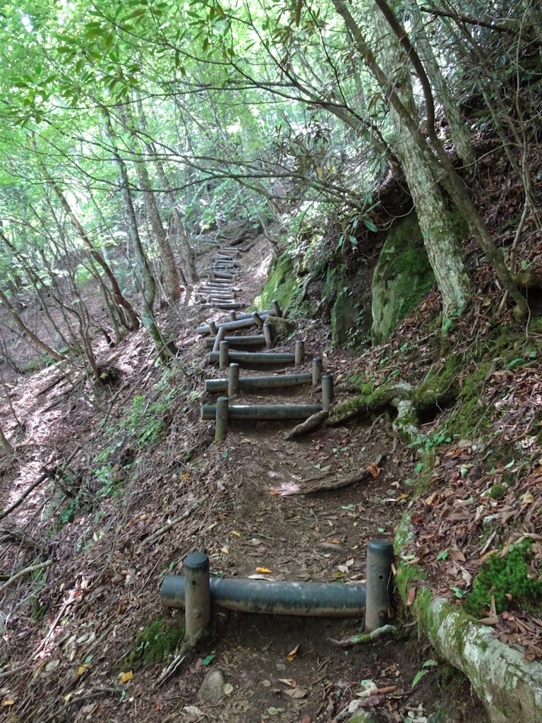 シャクナゲの群生地の標識からで木段(写真上)、土留めの階段(写真下)と続く急登を登り切ると、ポンと西沢渓谷終点に飛び出す。