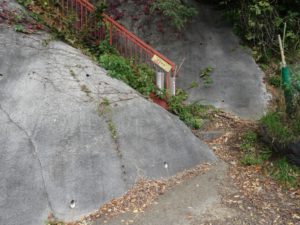 尾根上の階段(写真中)をひたすら下り、眺望コース入口(写真下)に降り立つ。