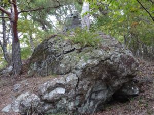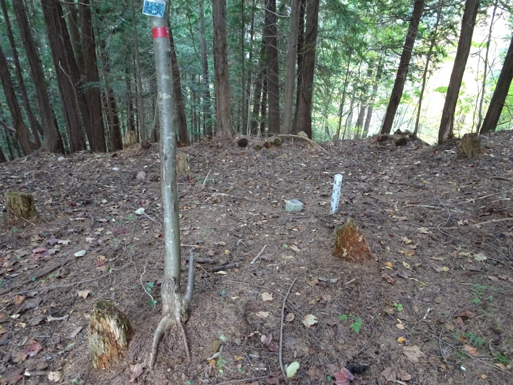 登り返してすぐ使われていない鉄塔を通過、ほどなく堂尾山公園(写真)に出る。ここは倉見山からの下山で三ッ峠駅方面に降りた分岐で、石碑や朽ちかけた東屋があったのだが、東屋は解体され残骸となっている。