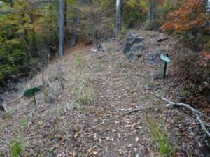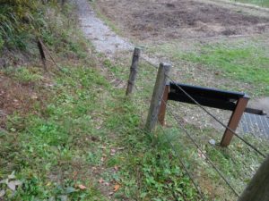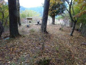 立派な橋を渡り杓子山ゲートウェイキャンプ場(写真上)の先で、林道脇の林の中に背戸山三角点(写真下)を見つける。林道からは見えないので、GPSがないと特定できないだろう。