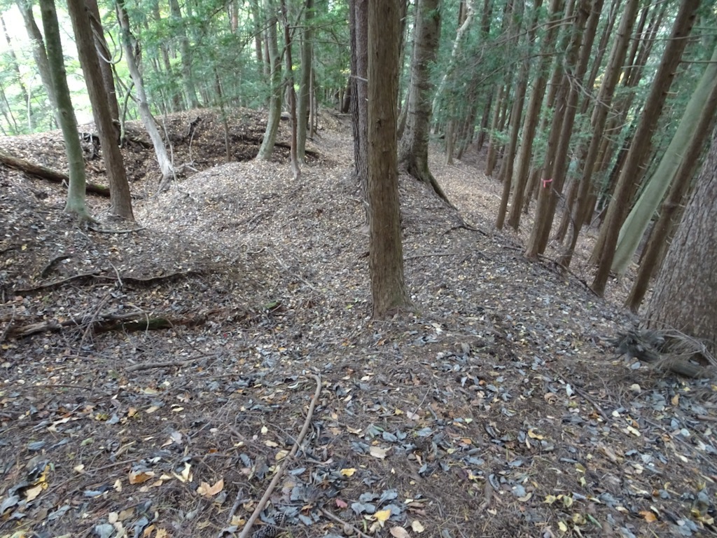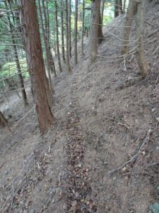 登山道なのか抉れた跡が平行する尾根(写真下)を下る。当然(?)道標はなく、たまに出てくるピンクテープを拾う。 途中で尾根が分かれる場所ではGPSを確認し、左の尾根に乗る。