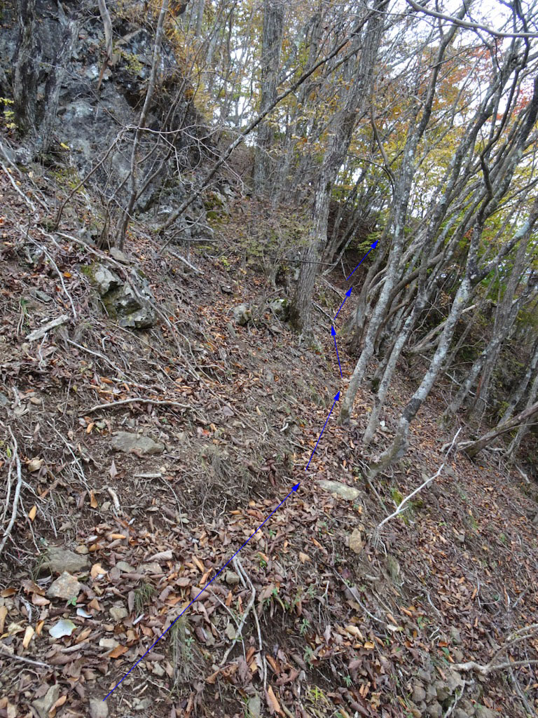 岩混じりの尾根を登り返し、その先では岩場を右に巻く(写真上)。 さらに岩場を越えた先で、尾根下の急斜面に付いた踏み跡(写真下)を深追いし、二進も三進も行かなくなり、20mほど戻り尾根に上がるはめになる。