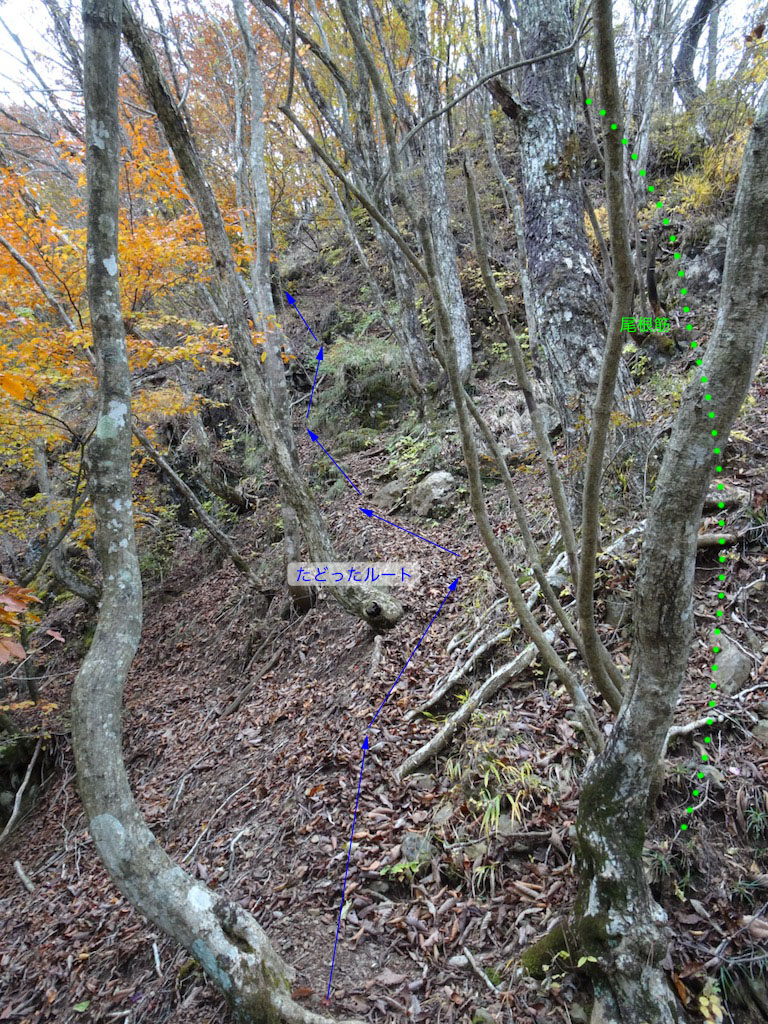 南側に延びる尾根を急下降する。 標高1200mあたりで踏み跡に引っ張られルートミス(写真上)をするが、すぐ気付いて2〜3分ほどのロスで済んだ。