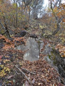 相定ヶ峰から杓子山までは、道標や目印が極端に少なく、ルートファインド必須。尾根通しではあるが、踏み跡に引っ張られ2度尾根を外してしまった。いずれもすぐに気付いてリカバーできたが、忠実に尾根をたどれば問題ないだろう。また、短いながら急登あり、岩場あり、岩混じりの尾根あり、痩せ尾根あり、と変化に富みなかなか手強い。