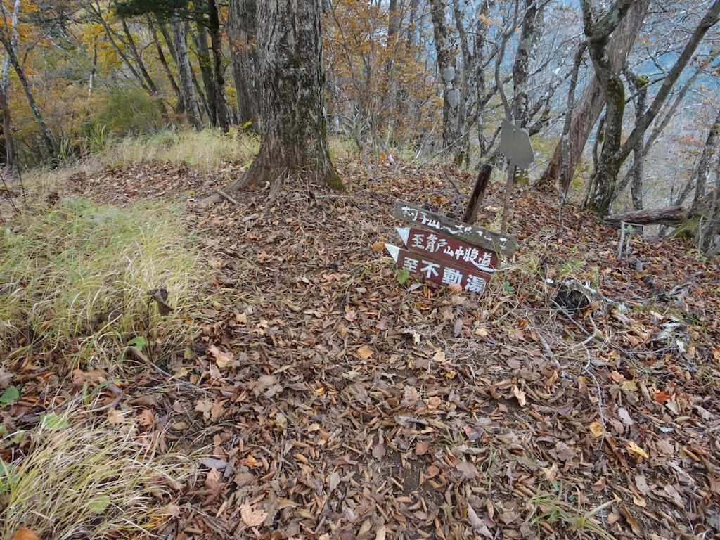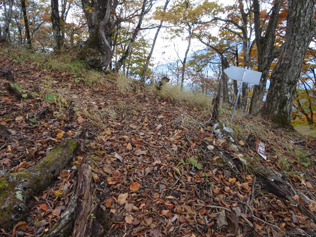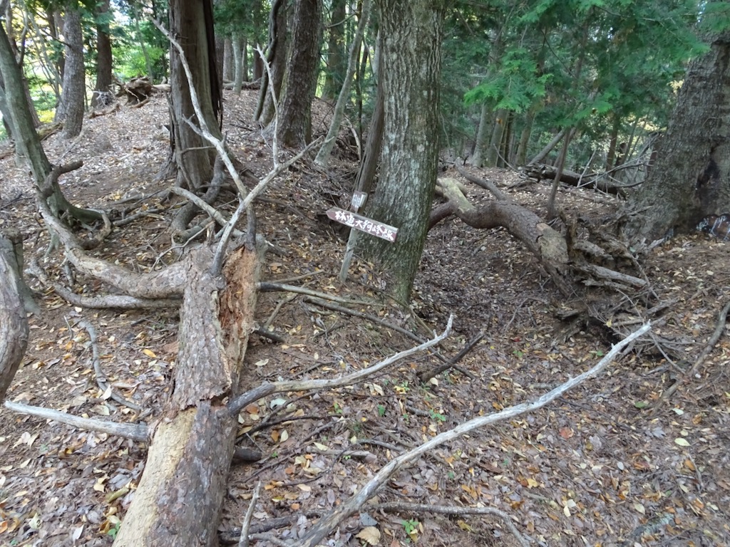 左を示す「山の神社」の道標をそのまま直進し、倒木の目立つ尾根をたどると、P1019の先で左を示す「林道天狗峰線」の道標(写真上)に行き当たる。普通はここで林道に降りるが、それでは面白くないので尾根を直進する。