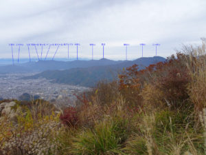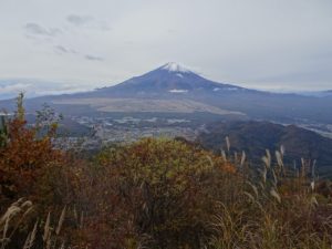 南側が大きく開け、富士山を初めに道志山塊、丹沢山地、愛鷹連峰、御坂山地、三ッ峠山、南アルプス、北側には潅木が煩いものの大菩薩嶺を一望する(写真下)。
