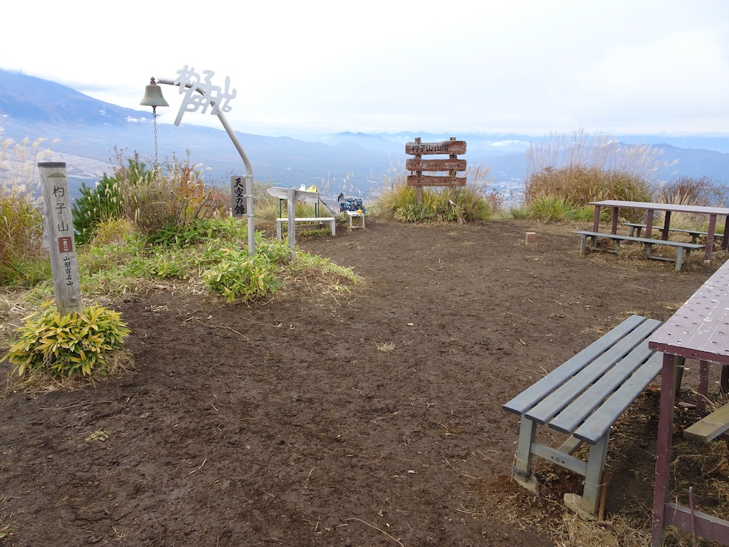 小広い山頂には山頂標柱や山頂標識、三角点、天空の鐘、数組のテーブルとベンチがある。 先着2組5人の登山者が居たが、先に下山し山頂を独り占めする。