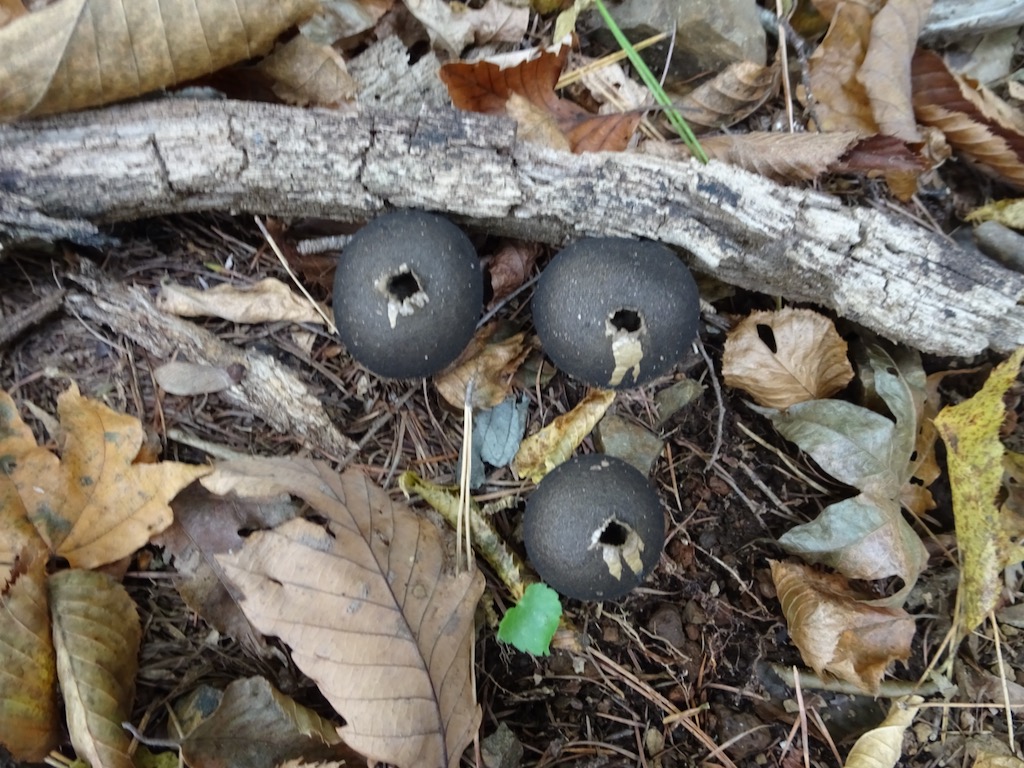 P1198を越え、下る途中でホコリタケ(写真)を初めて見る。突ついてみると、本当に胞子が煙のように出た。