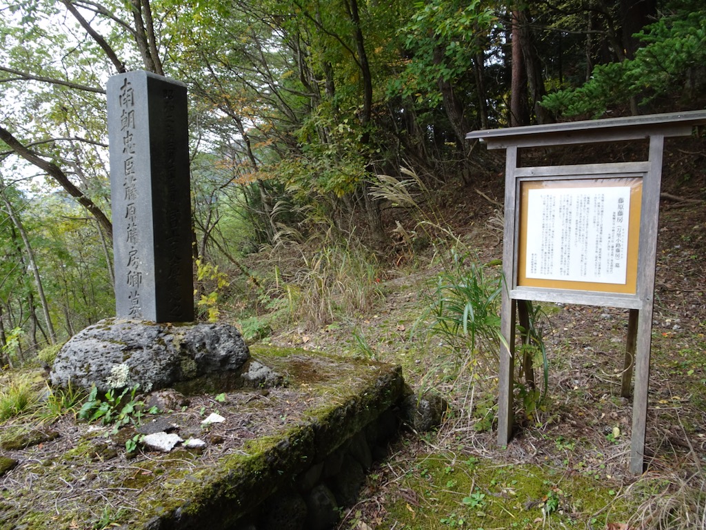 最後は踏み跡(?)をたどると、ほどなく忠臣藤原藤房卿の墓(写真)に出て、林道に降り立つ。