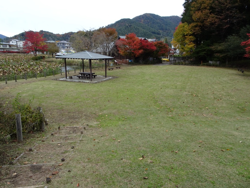 右の明見湖湖畔の散策コースをたどり、広場(写真)を横切ると、明見湖公園体験工房施設の横から駐車場に出る。
